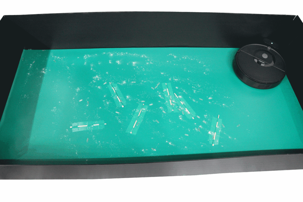 日々の清掃を省力化できないかを検証するために、一般家庭でも利用されているお掃除ロボットの実験をこれまで2回行いました。過去の実験ではクリーンルームの前室を想定し導電マット上で行いましたが、実際に前室(清掃可能範囲:約24㎡)でゴミを回収させた場合の除去率はどうなるか、具体的に数値化して比較検証致しました。 -